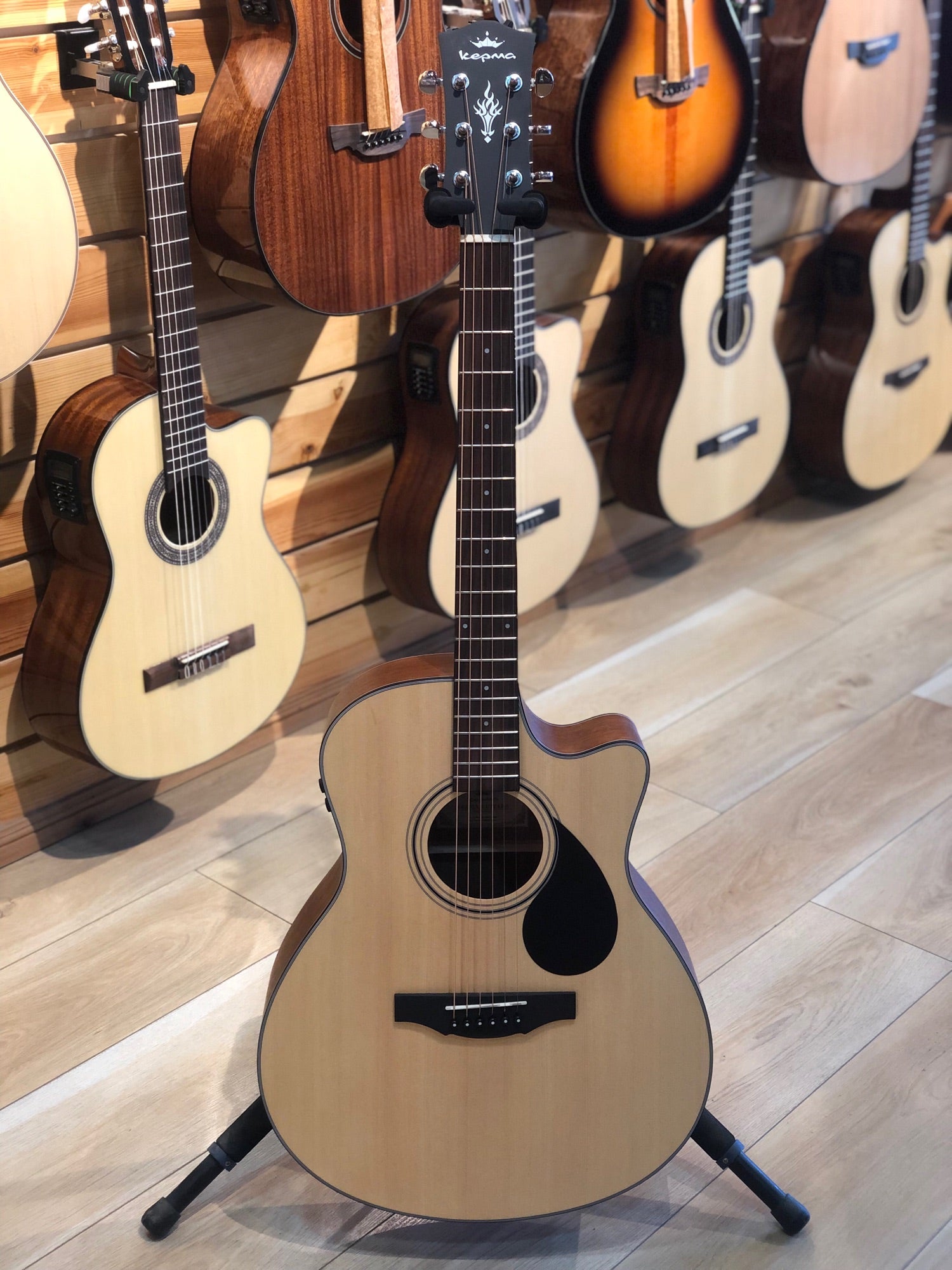 The Kepma EACE NM is a 41" Grand Auditorium semi-acoustic guitar featuring a spruce top and mahogany body. With its matte natural finish, smooth playability, and built-in K-1 pickup system, it’s perfect for both acoustic sessions and live performance.